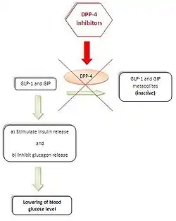 El efecto ventajoso de estos fármacos reside no en la propia inhibición de la DPP-4, sino en los efectos que de esta inhibición se derivan, como es la mayor semi-vida de eliminación (vida media) de las incretinas. Estas hormonas llamadas incretinas (Péptido similar al glucagón tipo 1 o (GLP-1: Glucagon-Like Peptide-1) y Glucose-dependent Insulinotropic Polypeptide realizan una serie de acciones ventajosas para el tratamiento de la Diabetes Mellitus Tipo 2, como son el estímulo de la secreción de insulina por las células beta del páncreas a la vez que tienen un efecto trófico positivo sobre estas células, retrasando la aparición de apoptosis e inhiben la liberación de glucagón por las células alfa.