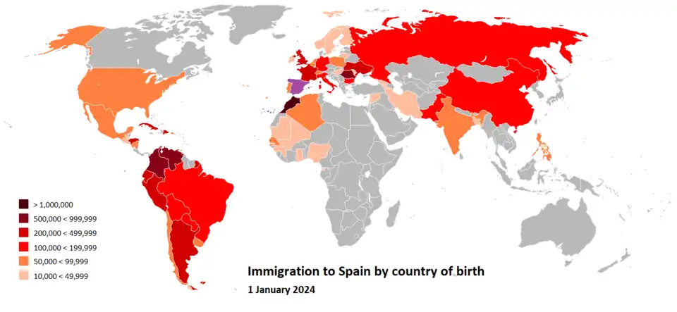 Entre 2020 y 2021, el flujo migratorio de argentinos a España aumentó un 65,8%, encabezando la lista de sudamericanos que más emigraron a España.[5] En 2022, la comunidad procedente de Hispanoamérica representaba casi el 60% de los inmigrantes en la Comunidad de Madrid frente a un 49% en enero de 2015. Esto sucedió debido al aumento de las comunidades de venezolanos, colombianos, peruanos, dominicanos y hondureños, entre otros, mientras que menguaron las de rumanos, chinos o marroquíes.[6] Los mayores aumentos de población extranjera en la primera mitad de 2022 se registraron entre los ucranianos (con un incremento del 45,8%), peruanos (+20,1%), colombianos (+19,1%) y venezolanos (+14,4%).[7] Asimismo, también se ha facilitado la llegada de inmigrantes rusos y latinoamericanos.[8][9] De acuerdo con el INE, España ganaría más de cuatro millones de habitantes en los 15 próximos años y más de cinco millones hasta 2072 si se mantuvieran las tendencias demográficas actuales, pasando de 47 432 805 a 52 886 370 de habitantes. La población de 65 y más años supondría el 26,0% del total en el año 2037.[10] Según el INE, a 1 de enero de 2025, la población de nacionalidad extranjera en España era de 6.853.348 personas (el 14,0%), y la población nacida en el extranjero era de 9.379.972 (el 19,1%), de un total de 49.077.984 habitantes.[11] España recibe inmigrantes principalmente de Iberoamérica, además de otras partes de Europa y África. En 2025, los grupos que más aumentaron su población en el país procedían de Colombia (43.400), Venezuela (30.500), Marruecos (27.700), Perú (18.800), Italia (8.900), Honduras (7.300), Argentina (7.300), Ecuador (6.800) y Ucrania (6.400).[11]