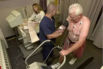Un hombre adulto en un examen de ejercicio para evaluar el estado funcional de su corazón