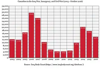 1,156 policías y 949 soldados asesinados 2.286 policías y 1.759 soldados heridos Pérdidas insurgentes 919+ muertos, 3.504 arrestados Bajas civiles 6.746 muertos y 10,511 heridos TOTAL DE CASIDADES 9,770 muertos (Cifras del gobierno, diciembre de 2011 - diciembre de 2013)[12] Bajas civiles 14,855 muertos (cifras de recuento de cadáveres en Irak, diciembre de 2011 - diciembre de 2013)[13] | |||||