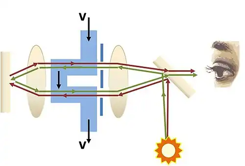 Sin embargo, cuando se hace circular agua al interior de ambos tubos las porción de rayos llegan desfasadas al observador, dado que la velocidad de la porción del rayo de luz se frena y la porción se acelera , cumpliéndose así el «Principio de Adición de velocidades de Galileo», ya que en este caso se adiciona de manera algebraica la velocidad de la luz con la del agua , dado que según el citado principio de Galileo, la velocidad de un objeto se mide en relación con un sistema de referencia dado.