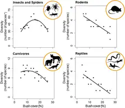 La invasión de arbustos puede dar lugar a un aumento de la abundancia y la riqueza de especies vertebradas. Sin embargo, estos hábitats invadidos y sus conjuntos de especies pueden volverse más sensibles a las sequías.[6][124]Dado que la invasión no es un estado estable, sino que se caracteriza por cambios en la densidad de los arbustos, es importante identificar cómo los diferentes umbrales de densidad afectan a las especies vegetales y animales.[125]