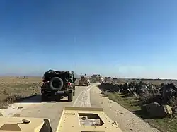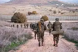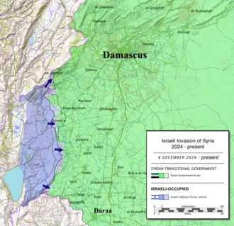 La invasión israelí de Siria comenzó el 8 de diciembre de 2024, durante la caída de Damasco y del gobierno de Ásad. Aprovechando el vacío de poder en Siria, unidades blindadas israelíes avanzaron hacia la zona de amortiguación de la Fuerza de las Naciones Unidas de Observación de la Separación entre Siria y los Altos del Golán ocupados por Israel y atacaron la zona rural central de la provincia de Quneitra con fuego de artillería.[36][37] La operación marcó la primera vez en 50 años que las fuerzas israelíes cruzaban la valla fronteriza siria, tras los acuerdos de alto el fuego del 31 de mayo de 1974 tras la guerra de Yom Kipur.[38]