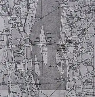 El puente que existe hoy en día, que conduce a la isla, fue construido en 1933. Fue elaborado sobre soportes originalmente establecidos para un puente de la calle propuesta Myslíkova (Puente Jiráskův).
