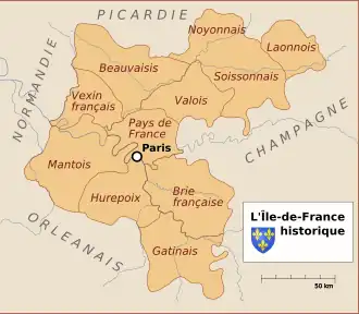 El área alrededor de París era el dominio personal original del rey de Francia, a diferencia de las áreas gobernadas por señores feudales de quienes él era el suzerano o soberano. Esto se refleja en divisiones como el Véxin Français y el Véxin Normand, el primero dentro del dominio del rey de Francia, el último dentro del feudo del duque de Normandía.