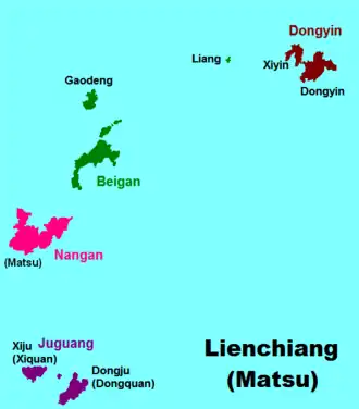El archipiélago se ubica a sólo 19 km de la China continental y a 190 km de la ciudad de Keelung en la isla de Taiwán. Abarca un área de 29,6 km² y se compone de cinco grandes islas: Nangan, Dongju, Xiju, Beigan y Dongyin. Se divide administrativamente en cuatro municipios: Nangan, Beigan, Dongyin y Juguang (del cual se componen Xiju y Dongju).