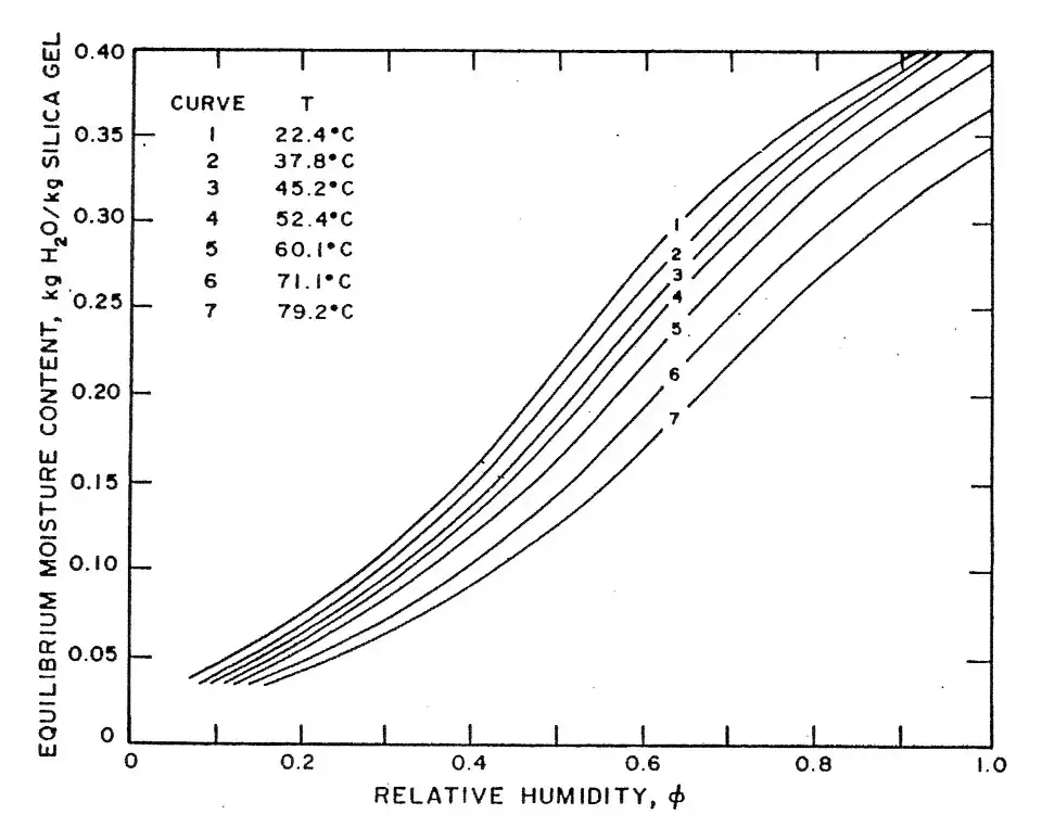 Los isotermas de sorción se nombran como tales porque el equilibrio establecido debe ser para una temperatura constante y esta temperatura debe especificarse. Normalmente, los materiales contienen menos humedad cuando están más calientes y más humedad cuando están más fríos. Ocasionalmente se proporciona un conjunto de isotérmicas en un gráfico que muestra cada curva a una temperatura diferente. En la figura tres, Dini representa este conjunto de isotermas de adsorción en un gel de sílice tipo V.[3]