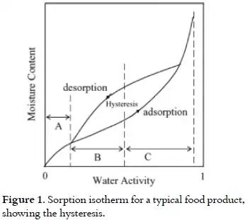 La relación entre el contenido de agua y la actividad hídrica (aw) es compleja. Un aumento de w suele ir acompañado por un incremento del contenido de agua, pero de manera no lineal. Esta relación entre la actividad del agua y el contenido de humedad a una temperatura determinada se denomina isoterma de sorción de humedad. Estas curvas se determinan experimentalmente. Constituyen un símil de huella dactilar de un sistema alimentario.[1]