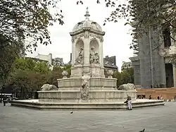 Entre 1844 y 1847 se construyó la Fuente de la plaza San Sulpicio. El proyecto fue edificado por el arquitecto Louis Visconti (1791–1853). Como escultores participaron Jean-Jacques Feuchère, François Lanno, Louis Desprez y Jacques-Auguste Fauginet, realizando cada uno de ellos respectivamente, la figura de los obispos Jacques-Bénigne Bossuet (al norte) , Fénelon (al oeste), Esprit Fléchier (al este) y Jean-Baptiste Massillon (al sur).