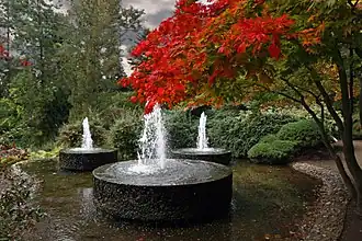 - Jardín monumental, con Rhododendron, de brezos (EricaceaeEricaceae), Paeonia, Azaleas (Azalea pontica), Bambús (Bambusoideae). Con árboles acompañantes tales como el Acer palmatum y el Cercidiphyllum japonicum que en otoño presentan una sinfonía de color