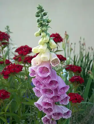 Floración de Digitalis purpurea, planta cultivada en el Savonlinnan kampuksen puutarha. | ||