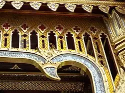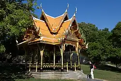 Producido en Bangkok siguiendo métodos tradicionales en madera de teca recubierta de pan de oro y decorada con vidrieras de colores y brillantes. Su techo está cubierto de placas que se asemejan a la piel de un dragón o a las escamas de un pez. Las agujas representan ángeles estilizados. Fue ensamblado con herrajes en la madera sin el uso de metales, por lo que no tenía un solo clavo ni tornillo.