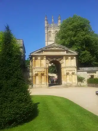 ![]() Entrada principal con la torre Magdalen al fondo. | ||