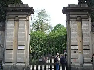 Por el edificio central, se accede a la terraza, cubierta con dos pérgolas en hierro que soporta rosales trepadores, del cual, por medio de una escalera en piedra gris de Florencia (pietra serena), se desciende al jardín; la escalera se flanquea de dos arbustos Feijoa sellowiana y Stranvaesia, que se encuentra podados en formas geométricas. Se pavimentan todas las avenidas de adoquines mientras que los parterres están delimitados por bordes bajos en piedra. Los bancos son de piedra, pero los enramados son de hierro.
