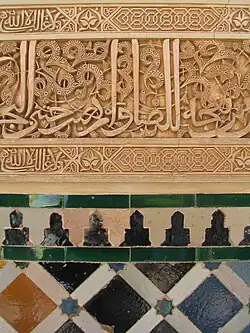 Motivos florales decoran las paredes y el estuco con escritura cúfica,[20] amplía su profusión de hojas entrelazadas. Los textos inscritos mezclan versos del Corán, acerca de la construcción del jardín y poemas: