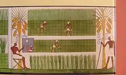La jardinería era un oficio muy arduo en el Antiguo Egipto. Los jardines necesitaban un riego continuo con agua transportada y elevada manualmente. También precisaban del desbroce de las malas hierbas y de una atención constante, incluyendo la reproducción artificial de la palmera datilera, lo cual requería una gran habilidad. Asimismo, se hacían grandes esfuerzos para evitar que los pájaros se comieran los cultivos. En este sentido, se idearon ingeniosas trampas para atrapar a las aves invasoras.[12]