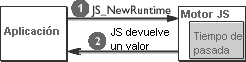 El primer paso lo inicia la aplicación que manda una instrucción , que luego, el motor de Javascript la interpreta y hace las manipulaciones pertinentes y después devuelve un valor. Con la función JS_NewRuntime se pasa las instrucciones y devuelve el valor pertinente.