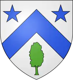 De plateado al chevron de azur acompañado, de dos estrellas iguales, y debajo un árbol de sinople.[7]