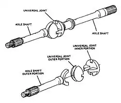 - ↑ En el tren delantero de un automóvil, estas uniones permitieron homogeneizar la velocidad del "eje delantero" (del círculo exterior) con la velocidad del "eje impulsado"[3] (del círculo interior): de hecho, las dos ruedas del eje delantero obviamente no tienen la misma velocidad en las curvas porque viajan en círculos concéntricos de la misma duración pero de diferente tamaño. El dominio de esta "homogeneización" "fue por lo tanto un progreso real[3]".