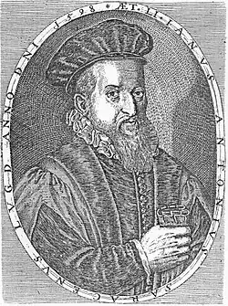 Grabado del autor, en el libro Opera Dioscoridis, graece et latine, cum scholiis, 1598 | ||