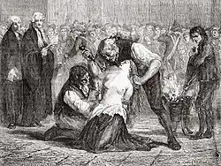 Por su parte, Jeanne fue hallada culpable y condenada a ser azotada, marcada con hierro candente y encarcelada de por vida. La mañana en que se dio cumplimiento a su sentencia, Jeanne fue arrastrada por catorce hombres, con quienes forcejeó durante todo el trayecto hasta las escaleras del Palacio de Justicia. Tras ser parcialmente desvestida para proceder a marcarla en un hombro con la letra V de «voleuse» («ladrona»), Jeanne se retorció violentamente al sentir el hierro candente, por lo que la marca acabó accidentalmente impresa en uno de sus senos, mordiendo acto seguido a uno de sus verdugos y desmayándose a continuación, tras lo cual fue conducida a La Salpêtrière, lugar donde, según su sentencia, debía cumplir cadena perpetua trabajando con un hábito de tela gris y zuecos y alimentándose de pan negro y lentejas.[4]