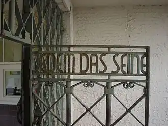 - ↑ «„Jedem das Seine“». Buchenwald.de (en alemán). Consultado el 25 de marzo de 2024. «Das Lagertor soll die von der SS geschaffene Grenzlinie zwischen nationalsozialistischen „Herrenmenschen“ und „Minderwertigen“ sichtbar herausheben.»
