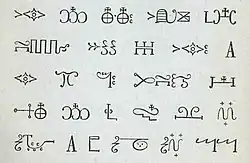 Texto ritual empleado en el Rito de Confirmación, en jeroglíficos micmac. El texto significa Koqoey telikaqumilálaji msɨt Nakli -?, literalmente, «¿Por qué / os / todo / después de que él las hizo?», o «¿Por qué todos estos pasos son necesarios?».
