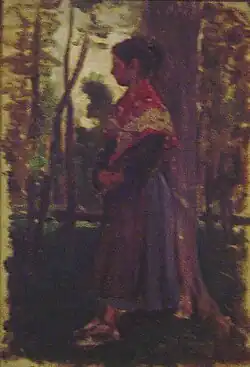 Estudio de una figura femenina de perfil, apoyada sobre un árbol, vestida con traje tradicional catalán. Ingresó en el museo en 1956, proveniente la colección privada de Lluís Plandiura i Pou.[26] | ||||||||