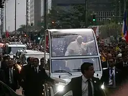 En este viaje, el papa Francisco mostró la continuidad de un estilo pastoral indicativo de su deseo de vinculación con su grey, que incluyó su determinación de renunciar a la seguridad para estar más cerca de la gente. Para recorrer Río de Janeiro y Aparecida, se reemplazó el papamóvil blindado por un vehículo blanco totalmente abierto en los laterales, similar al empleado en las audiencias generales de los miércoles para recorrer la plaza de San Pedro,[30] a lo que Francisco sumó roturas del protocolo —incluso bajo la lluvia— para acercarse a los fieles.[31]