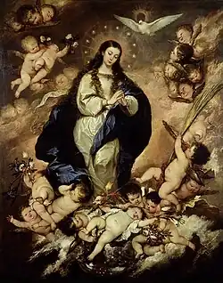 En este orden destacan sus múltiples versiones del tema de la Inmaculada, de las que se conocen una veintena larga de ejemplares autógrafos, número solo igualado por Murillo.[9] Las Inmaculadas de Antolínez, de aire elegante y cortesano, se caracterizan por el tratamiento pormenorizado de la corona de doce estrellas, la inclusión frecuente de la paloma del Espíritu Santo, el gesto ensimismado de la Virgen con las manos unidas y el revuelo de ángeles niños que le sirven de peana. Sus lujosas vestimentas, con destellos plateados, parecen agitadas por un fuerte viento ascensional. La más antigua de las conservadas, la de la Colección March de Palma de Mallorca, está fechada en 1658 y en su composición se advierten aún influjos de Alonso Cano que desaparecen en las versiones posteriores, en las que introdujo sutiles variaciones en el movimiento de los paños para no repetirse nunca. Entre ellas pueden destacarse las versiones del Museo del Prado, fechada en 1665, la del Museo Lázaro Galdiano, de 1666, Museo Nacional de Arte de Cataluña, muy semejante a la conservada en la Hermandad del Refugio de Madrid, fechada ésta en 1667, Museos de Bellas Artes de Sevilla y Bilbao, Pinacoteca Antigua de Múnich, de 1668, y Museo Ashmolean de Oxford.También destaca la Inmaculada que se encuentra en la catedral de Almería, fechada en el tercer tercio del siglo XVII firmada por el autor.