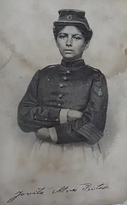 A los 17 años, intentó convertirse en soldado en la Guerra de la Triple Alianza. Disfrazada de hombre, con corte de pelo al estilo militar, los pechos tapados y tocado militar, caminó más de 250 millas[4] hasta la capital de la provincia para alistarse. Sus rasgos femeninos y los agujeros en las orejas[3] la delataron y fue desenmascarada por una mujer en el mercado.[5]