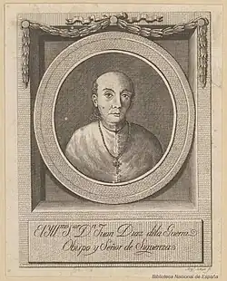 ![]() «El Yll.mo S.or D.n Juan Díaz dela Guerra Obispo y Señor de Sigüenza», grabado calcográfico de Miguel Birués, Biblioteca Nacional de España | ||