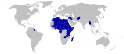 Alto Volta, Argelia, Benín, Camerún, Chad, China, Congo, Egipto, Etiopía, Gabón, Gambia, Ghana, Guyana, Irak, Kenia, Lesoto, Libia, Madagascar, Malaui, Malí, Marruecos, Níger, Nigeria, República Centroafricana, Somalia, Suazilandia, Sudán, Taiwán, Tanzania, Togo, Túnez, Uganda, Zaire y Zambia.[5]
