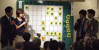 - ↑ a b Maruyama, Susumu (8 de agosto de 2019). «Shogi Renmei ga Shikitei Puro Kishi to Joryu Kishi no Kenmu Mitomeru» [Japan Shogi Association announces new rule permitting women's shogi professionals to retain status if they also qualify as "regular" shogi professionals]. Mainichi Shimbun (en japonés). Consultado el 15 de agosto de 2019.