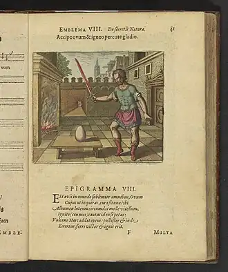 ![]() Emblema VIII. Accipe ovum & igneo percute gladio (Toma el huevo y golpéalo con una espada de fuego), incluido en el manuscrito alquímico Atalanta fugiens del médico alemán Michael Maier. Imagen de portada en la edición española publicada por Ediciones Atalanta. | |||||