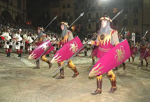 La justa es una evocación histórica en vestimenta medieval que se desarrolla en Arezzo desde hace siglos, presumiblemente desde el siglo XIII.