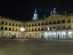 Nada más regresar a Vitoria, el alcalde, Ramón María de Urbina, le encargó la Plaza Nueva,[5] cuya construcción se inició el 17 de octubre de 1781 y no se terminaría hasta diez años después.[4] Aunque suscitó varias críticas, el ayuntamiento aprobó todo cuanto Olaguíbel había hecho, hasta tal punto que le autorizaron la construcción de los Arquillos, ideados por él para sortear el desnivel y conectar la ciudad medieval y el Ensanche moderno.[4] En una reseña biográfica publicada en 1896 en la revista Euskal-Erria, se dice de ellos que «constituyen un verdadero monumento greco-romano, en el que se aúnan la valentía de la construcción, la severidad del estilo y el acierto y conocimiento del terreno, constituyendo un hermoso paseo de soportales y balcones, encima, al lado y debajo de viviendas particulares, cómodas y extensas, y á considerable altura».[4] Concluidos en 1794, serían descritos por Fabián Ortiz de Pinedo, que escribía para El Liberal, como «la construcción más original y atrevida que cabe imaginar».[6] Satisfecho el consistorio con estos trabajos, le donó un terreno, en el costado norte de lo que era entonces el convento de San Francisco, en el que Olaguíbel construyó una manzana de casas que luego pasaría a manos de sus descendientes.[7]