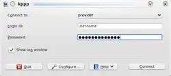 Kppp se usa generalmente para conectarse a un proveedor de Internet a través de un módem y una línea telefónica, a pesar de que se puede utilizar en otras situaciones donde el protocolo PPP sea necesario. Se trata de una interfaz gráfica para el demonio pppd, diseñado para hacer más fácil a los usuarios no técnicos para conectarse a Internet usando un sistema KDE.
