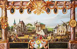Se puede ver la plaza de la iglesia de Kaisersteinbruch, a la derecha la casa parroquial, a la izquierda la iglesia con la capilla encargada por el emperador. El artista ha entrelazado dos niveles temporales, el de las personas del siglo XVII, reconocibles por su vestimenta, y el de las personas del presente (siglo XIX) paseando por la plaza de la iglesia. Algunas personas del pasado tienen gran parecido a las de hoy. Aunque los actores de distintas épocas estén cerca unos de otros, no puede haber contacto.