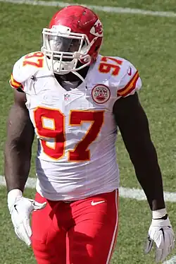 Por otro lado, la indumentaria de los Chiefs se ha mantenido esencialmente igual a lo largo de la historia del club.[16][19] Consiste en un casco rojo y camisetas rojas o blancas con los números y nombres de colores opuestos, aunque se usaron pantalones blancos con ambas versiones de manera consecutiva en los periodos 1960-67 y 1989-99, siendo recuperada esta combinación en las últimas temporadas.[20] A su vez, la mezcla de la camiseta blanca y el pantalón rojo no se utilizó en las etapas nombradas anteriormente.[20] De igual manera, en varias ocasiones han usado indumentarias especiales con el objetivo de rendir homenaje o por casos específicos.[21] Un ejemplo de ello es cuando vistieron de blanco para un par de partidos como visitantes a finales de 2006, con el fin de honrar al recién fallecido Hunt,[22] a la par que en tres encuentros de la campaña 2009 jugaron con los uniformes de 1962, como también hicieron otros con motivo del cincuenta aniversario de la American Football League (AFL).[23] En 2007 incluyeron de forma permanente en su camiseta un parche en memoria de Hunt y la AFL,[24] que consiste en la insignia de la liga extinta y las iniciales del fundador de los Chiefs en el centro del balón.[21] Nike es el proveedor oficial de los uniformes para todos los equipos de la NFL desde 2012.[25][26]