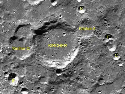 Por convención estos elementos son identificados en los mapas lunares poniendo la letra en el lado del punto medio del cráter que está más cercano a Kircher.