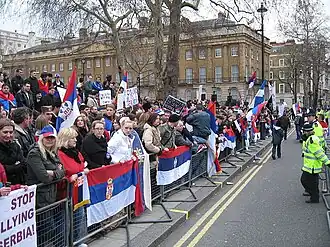 - Estados Unidos: Los manifestantes se concentraron ante la Sede de la Organización de las Naciones Unidas en Nueva York,[10] y en otras varias ciudades con importante comunidad serbia, como Chicago, Los Ángeles y San Francisco.
