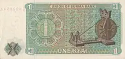En 1944, el Banco Estatal de Birmania introdujo billetes de 1, 5, 10 y 100 kyat, seguidos de una nueva emisión de 100 kyat en 1945.