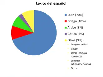 El léxico del castellano está constituido por alrededor de un 75 % de palabras derivadas del latín, un 15 a 20 % derivadas del griego,[3][4] un 8 % del árabe, un 3 % del gótico, y un 9 % de palabras derivadas de distintas lenguas (como otras lenguas germánicas, persa vía árabe o amerindias como el quechua): [cita requerida]