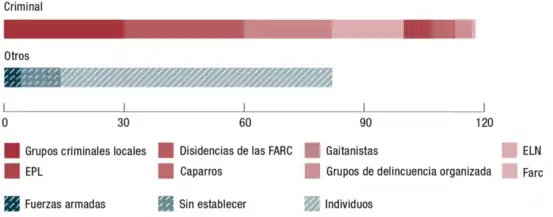 Los datos de investigaciones judiciales adelantadas sugieren que una amplia gama de grupos es responsable de los asesinatos de líderes sociales. La Fiscalía General informa que a junio de 2020, en los 201 casos que cree haber resuelto, aproximadamente el 59 por ciento de los responsables estaban vinculados a grupos armados; otro 39 por ciento se trataba de personas sin afiliación o pertenecientes a grupos desconocidos; mientras que el 2 por ciento se trataba de personal militar.[23] Las fiscalías seccionales atribuyen la mayoría de los asesinatos cometidos por grupos armados a facciones disidentes de las FARC-EP y bandas armadas locales sin presencia nacional.