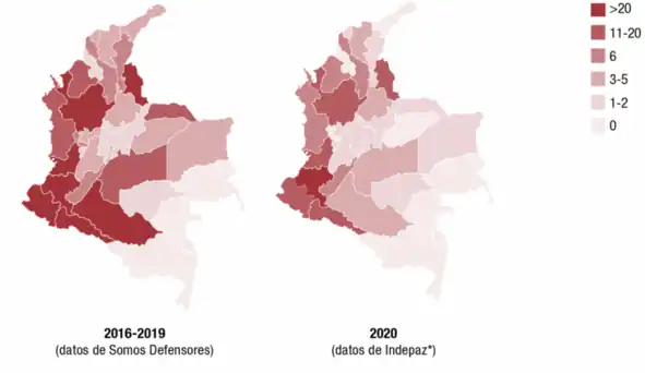 Según la Comisión de la Verdad, desde el año 1986 han sido asesinados en Colombia 4.756 representantes líderes de diferentes sectores sociales. Durante 2016-2019 han sido asesinadas cada mes, en promedio, doce personas defensoras de derechos humanos. Según el último informe anual del Programa Somos Defensores, en 26 de los 32 departamentos de Colombia se registraron casos de asesinatos de personas defensoras de derechos humanos.[16] Según la organización Somos Defensores, entre 2002 y 2017 fueron asesinados 664 líderes sociales.[19]