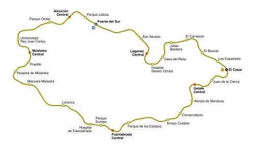 - Es la única línea de la red de metro que no conecta directamente con la capital (solo se une a ella a través de la línea 10 en Puerta del Sur y la línea 3 en El Casar), manteniéndose fuera del término municipal de Madrid durante todo su recorrido.