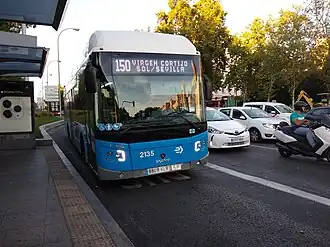 La línea 150 de la EMT de Madrid une Sol / Sevilla con la Colonia Virgen del Cortijo a través del eje de la Castellana.