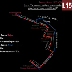 La línea 15 del Transport Urbà de Castelló (TUCS) conecta desde el Polideportivo Ciudad de Castellón con la Universidad Jaime I (UJI). Solo presta su servicio de lunes a viernes.[1]