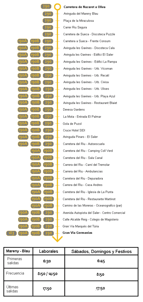 Une Valencia con, La Punta, Pinedo, El Saler, Les Gavines, El Perellonet, El Perelló y Mareny Blau. Tiene determinadas salidas a lo largo del día, siendo estas un total de 3 en cada sentido de la línea. En verano amplia su oferta para poder dar servicio a las playas del sur de Valencia.